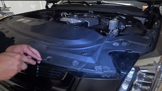 The first step is removing the large plastic panel under the hood. It’s held in place by 14 clips. Use a small flat-head screwdriver to gently pry each clip up, then pull it out. Once all clips are removed, the panel should lift right out.